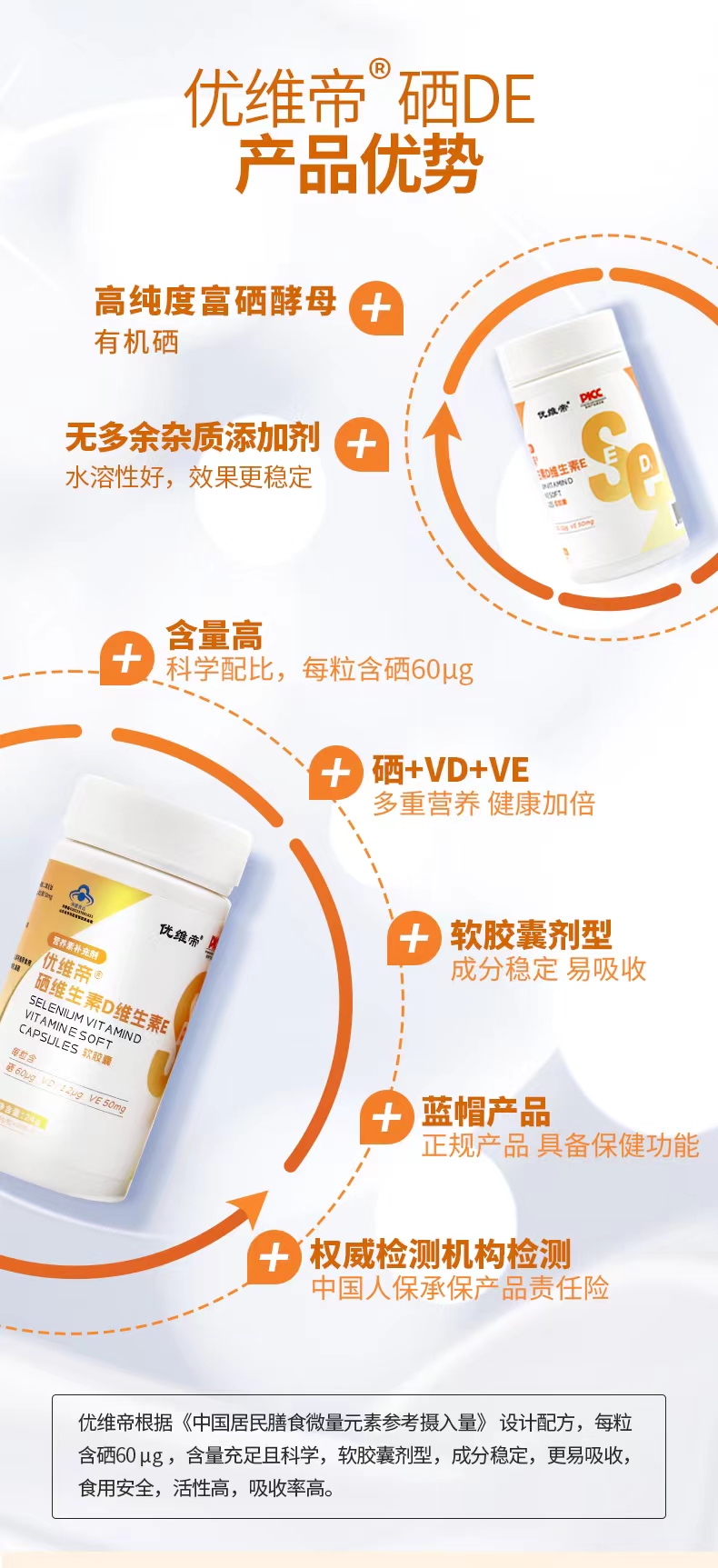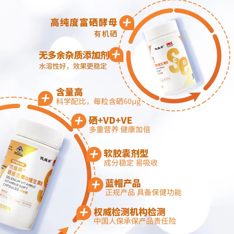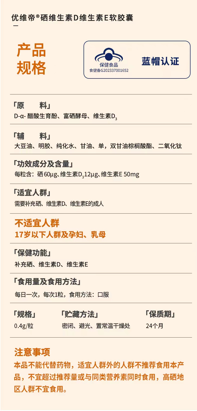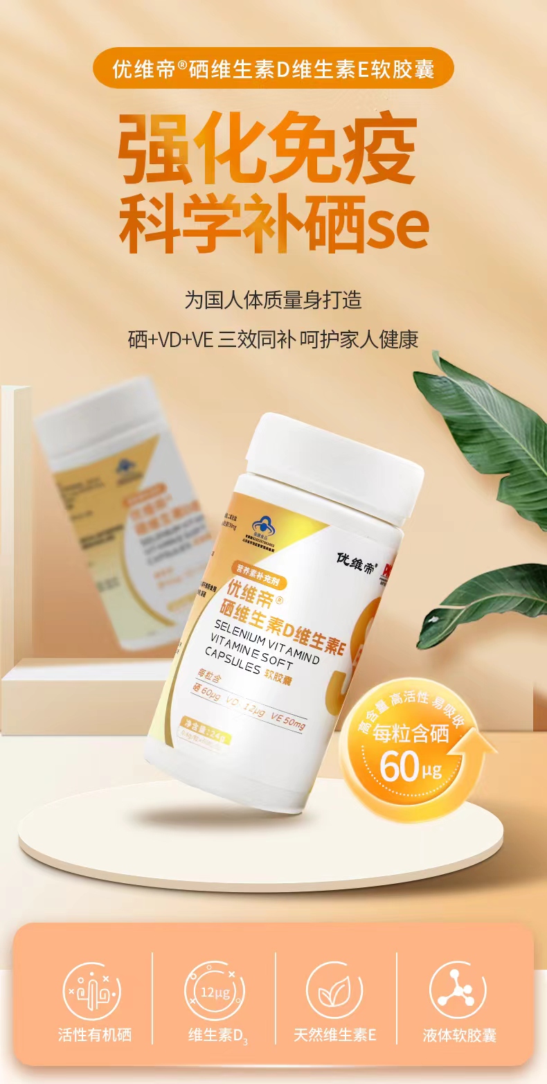 , createDate:2024-03-29 10:12:49.0, tagIdValue:, isHeadline:null, likes:0, image:null, modelFieldValue:{"syz":"補充硒、維生素D、維生素E的成人","jiage":"每粒含:硒60ug、維生素D3 12ug、維生素 50mg","ssff":"口服","tymc":"優維帝牌維生素D維生素E軟膠囊","sslssff":"每日一次,每次1瓶,食用方法:口服","pzwh":"食健備:G202337001652"}, author:小優, sort:null, isTop:null, subtitle:null, siteId:13, oppose:0, categoryId:1130, status:1}